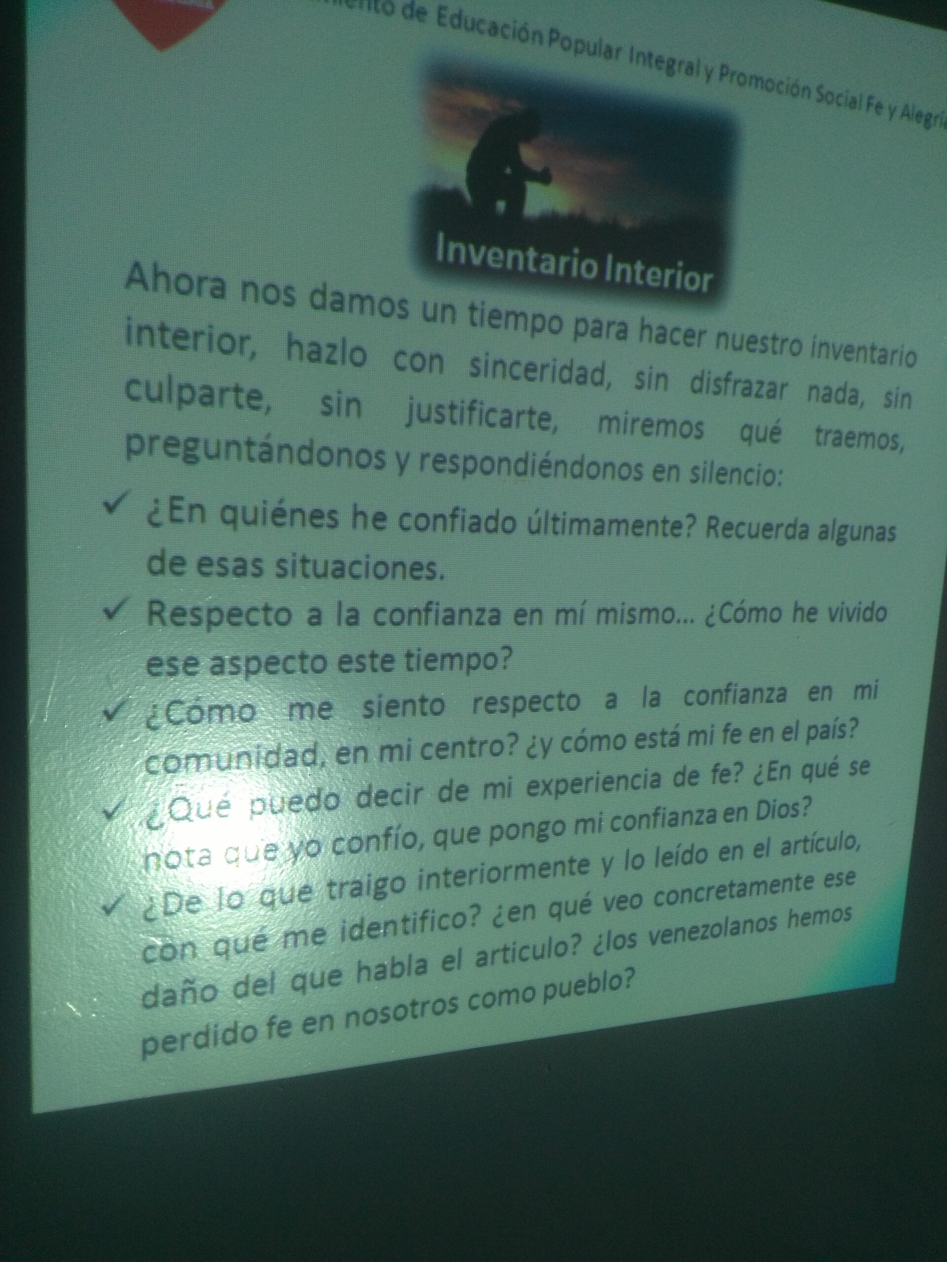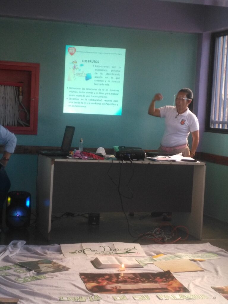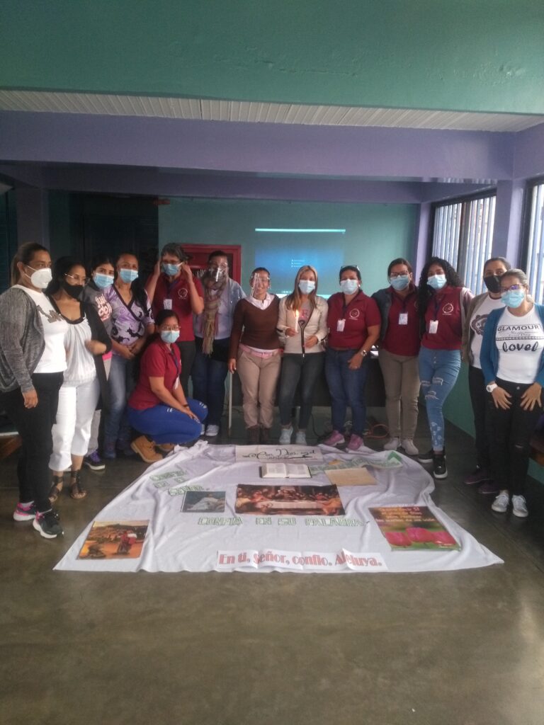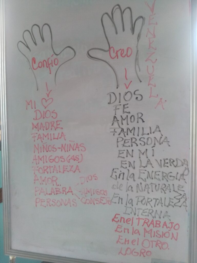 Actividad para reforzar la espiritualidad a través de la motivación y la fe en Dios, el taller tuvo la participación del Personal de Preescolar y del Centro de Formación y Capacitación Calasanz . Se llevaron a cabo varias reflexiones , dibujando las manos de en quien Creo y en quien Confió, analizamos un articulo de Laureano Márquez; Creer en Venezuela , elaboramos nuestro propio «Credo». La luz es el camino a la Fe; «El Creer me Ayuda a Confiar»